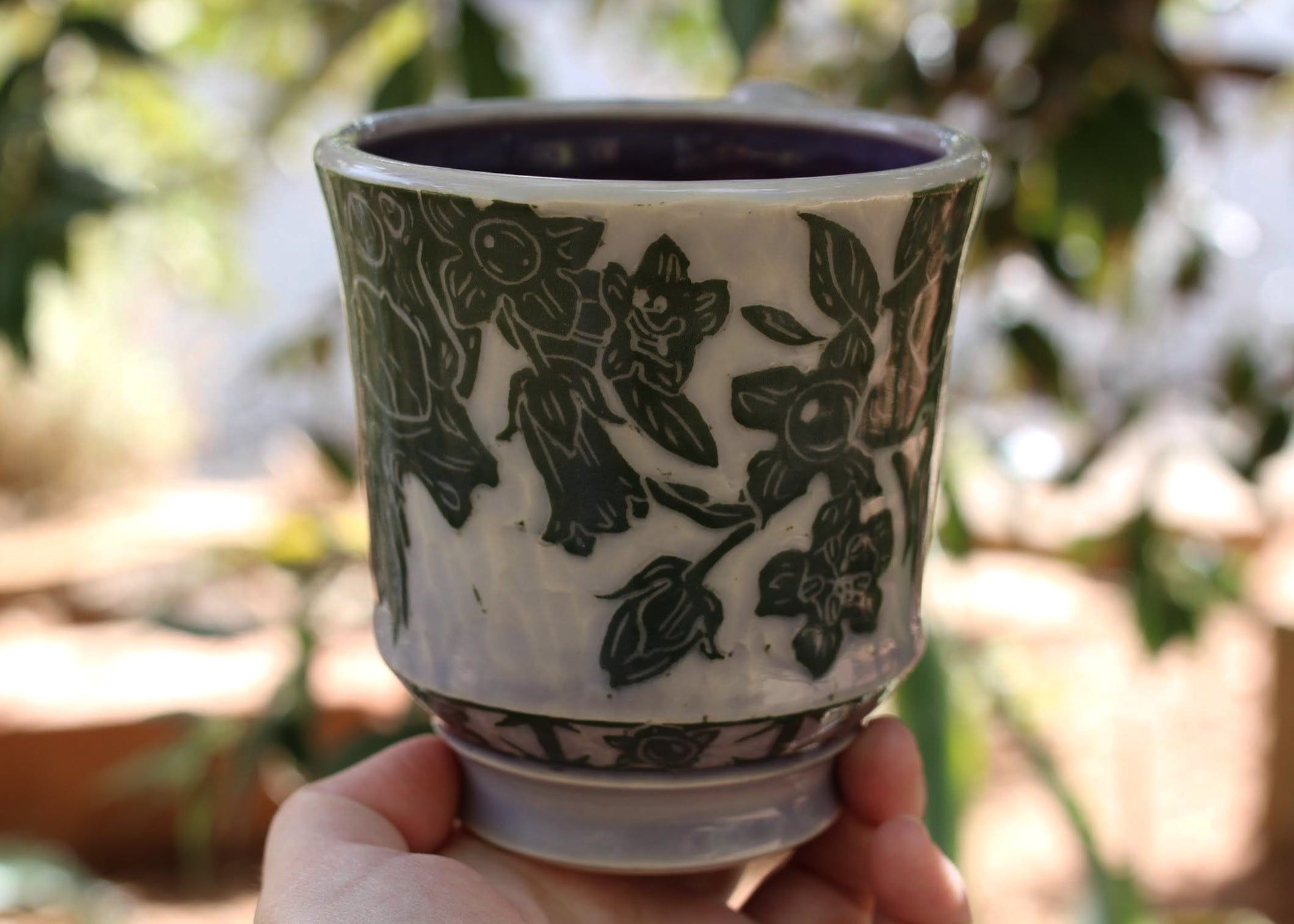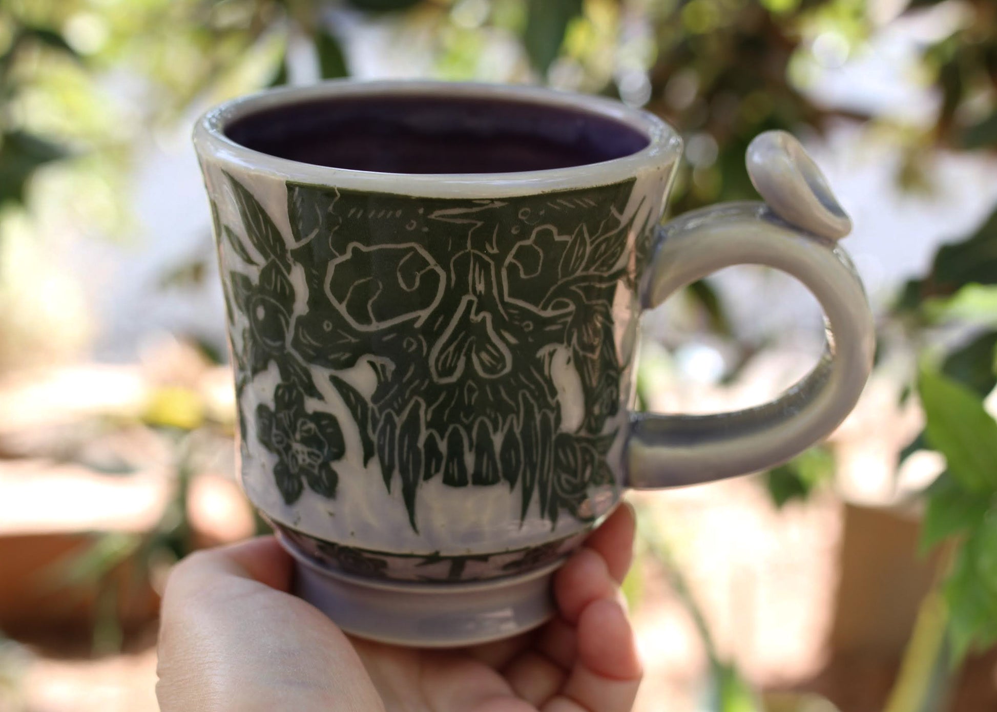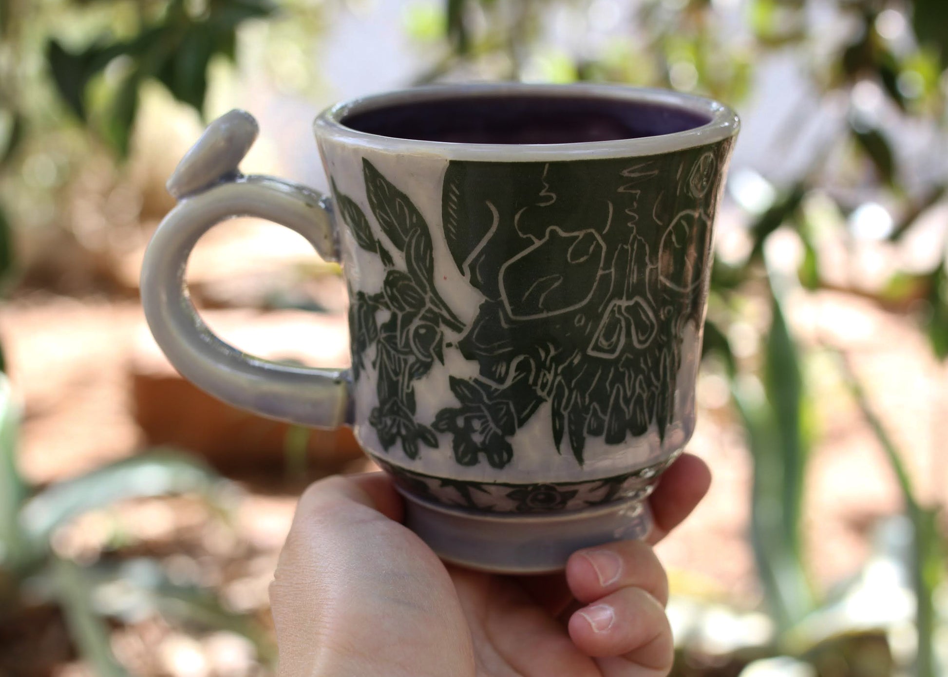 There are two pinholes on the inside rim of this mug, discounted heavily due to flaw.